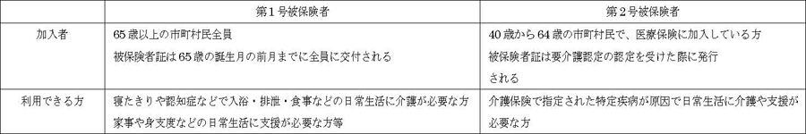 第1号被保険者(65歳以上)は、介護(寝たきりなどで入浴・食事や排泄などの日常生活動作への介護)や支援(家事や身支度などの日常生活での支援)が必用な時、介護保険を適用してのサービスを受けることができる。(自己負担1割)第2号被保険者(40歳以上65歳未満の医療保険の加入者)は、初老期認知症、脳血管障害などの老化に伴う病気又は特定疾病(末期ガンなど)の介護が必要になった場合のみ介護保険のサービスを受けることができる。