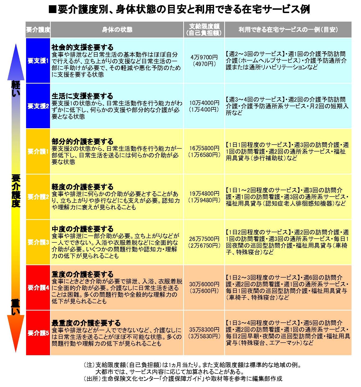 - 要介護度別、身体状態の目安と利用できる在宅サービス例