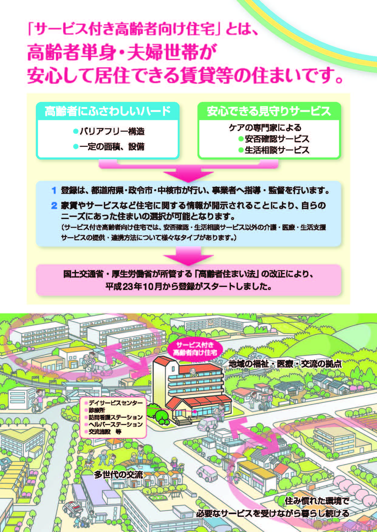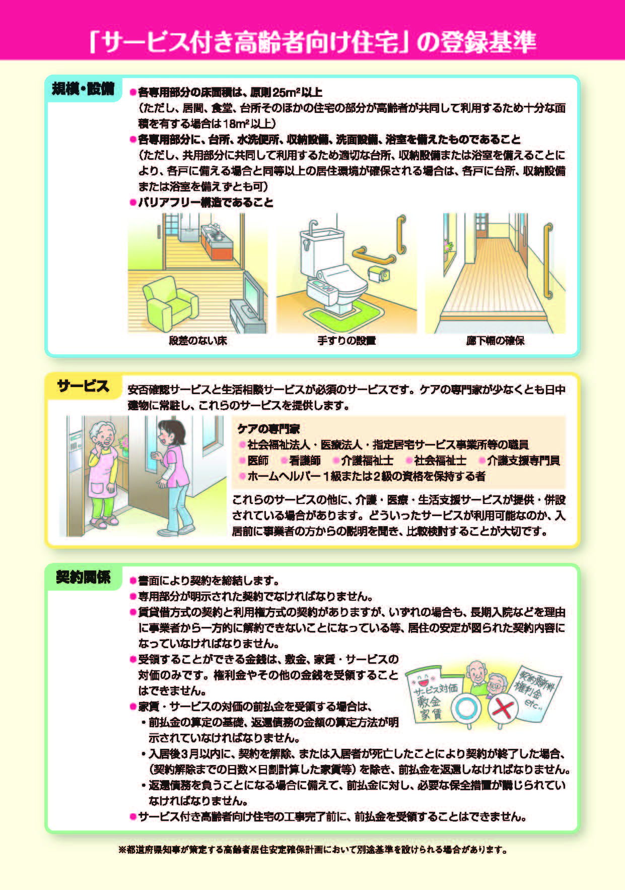 住宅としての居室の広さや設備、バリアフリーといったハード面の条件を備えるとともに、ケアの専門家による安否確認や生活相談サービスを提供することなどにより、高齢者が安心して暮らすことができる環境を整えてます。